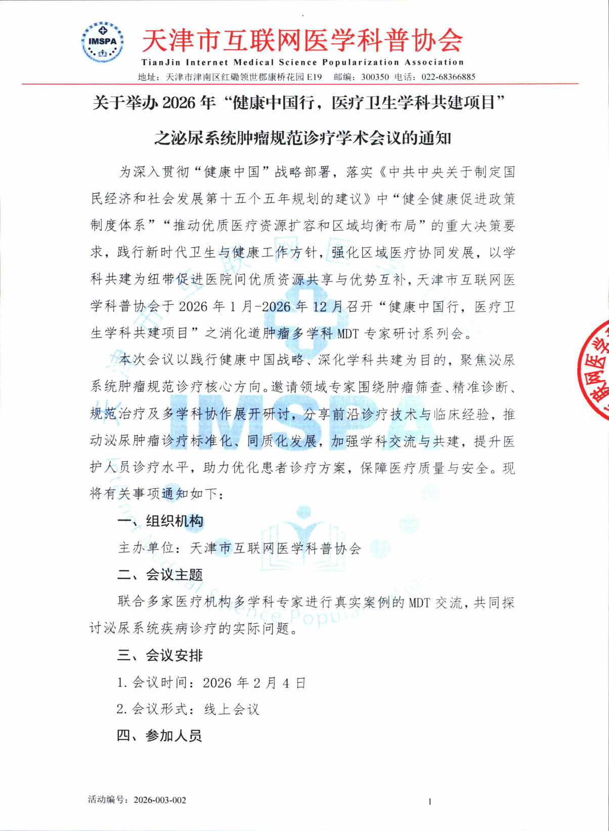 关于举办2026年“健康中国行,医疗卫生学科共建项目”之泌尿系统肿瘤规范诊疗学术会议的通知
