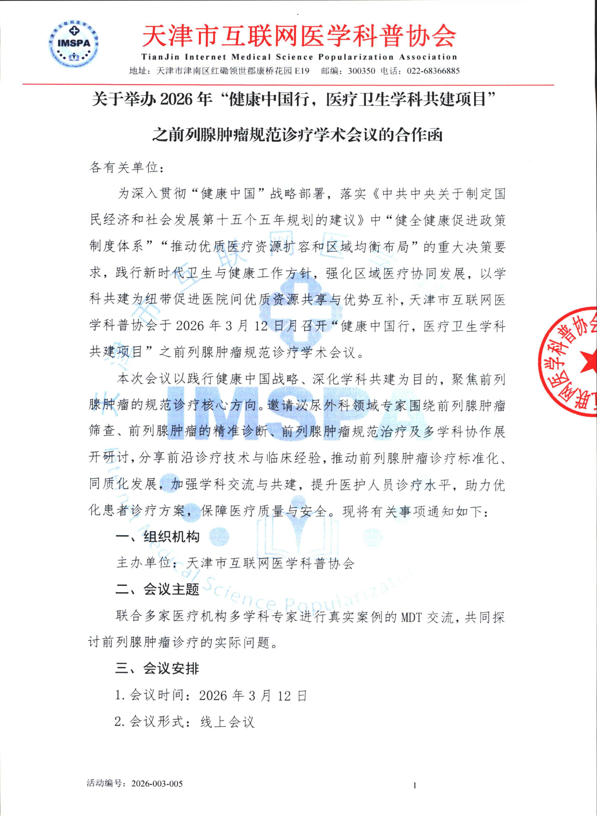 2026-003-005关于举办2026年“健康中国行,医疗卫生学科共建项目”之前列腺肿瘤规范诊疗学术会议合作函