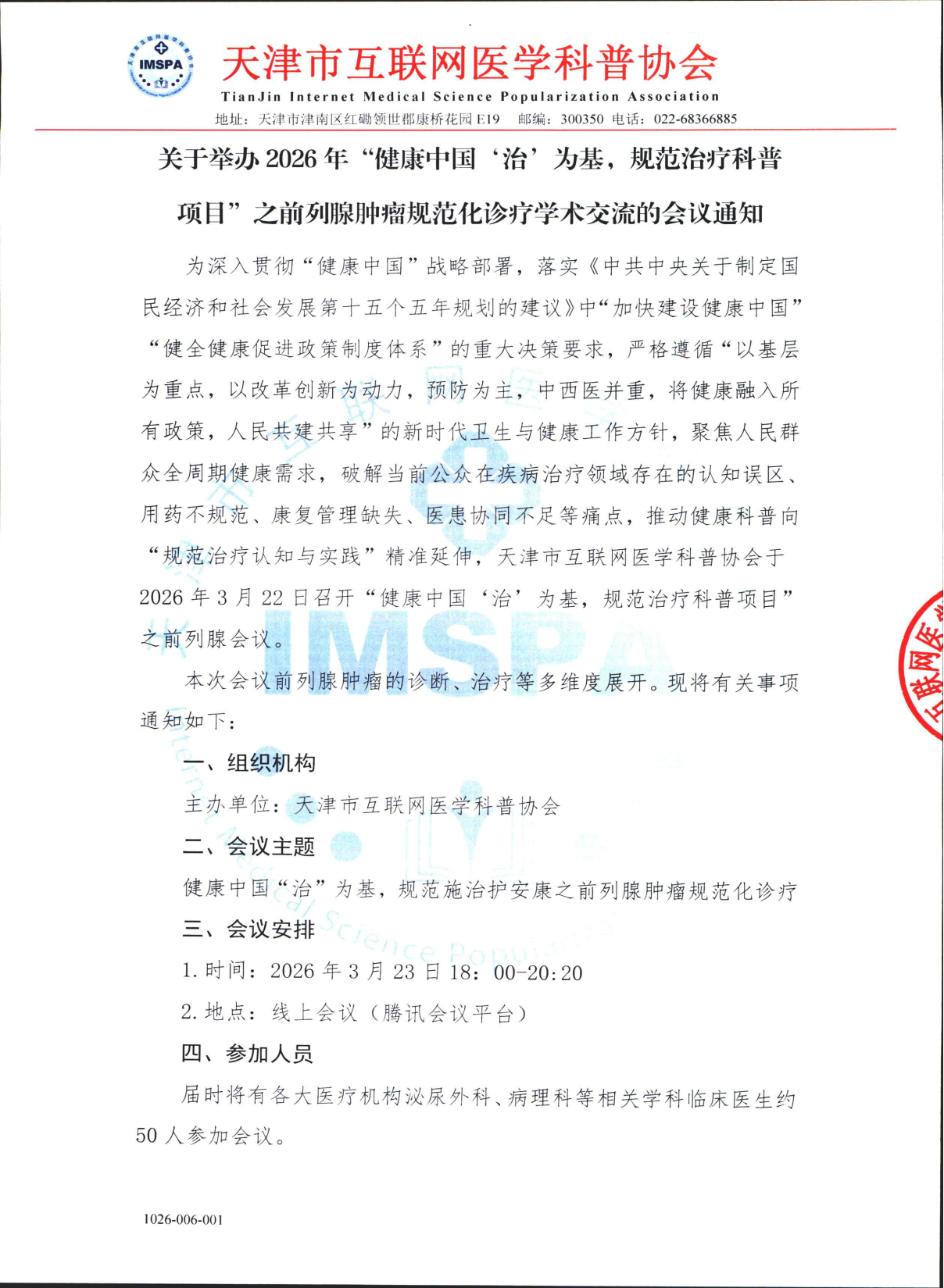 2026-006-001关于举办2026年“健康中国‘治’为基,规范治疗科普项目”之前列腺肿瘤规范诊疗学术交流会议会议通知