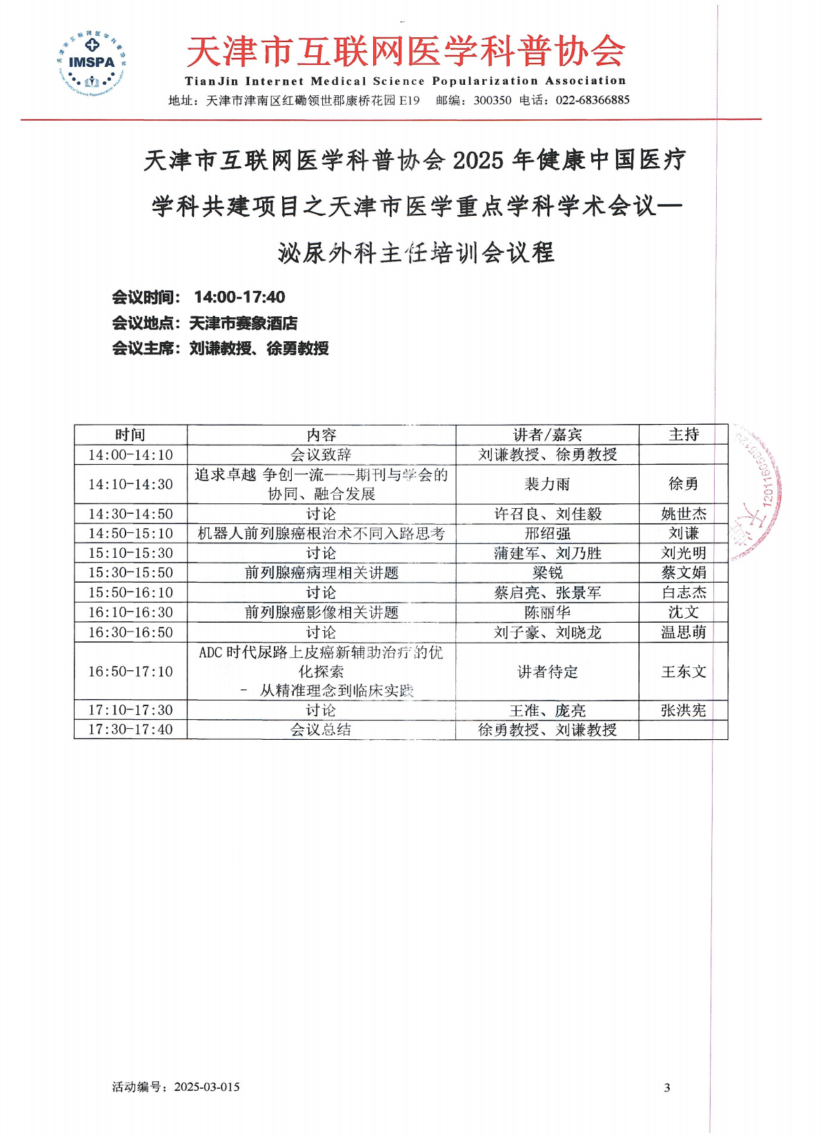 关于召开天津市互联网医学科普协会2025年健康中国医疗学科共建项目之天津市医学重点学科学术会议-泌尿外科主任培训会通知