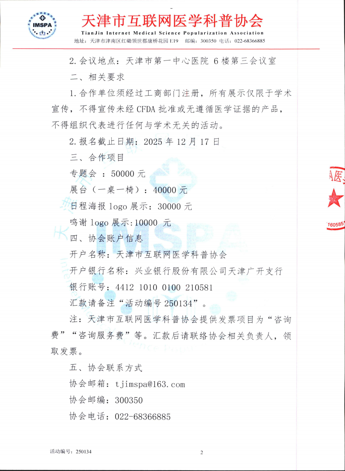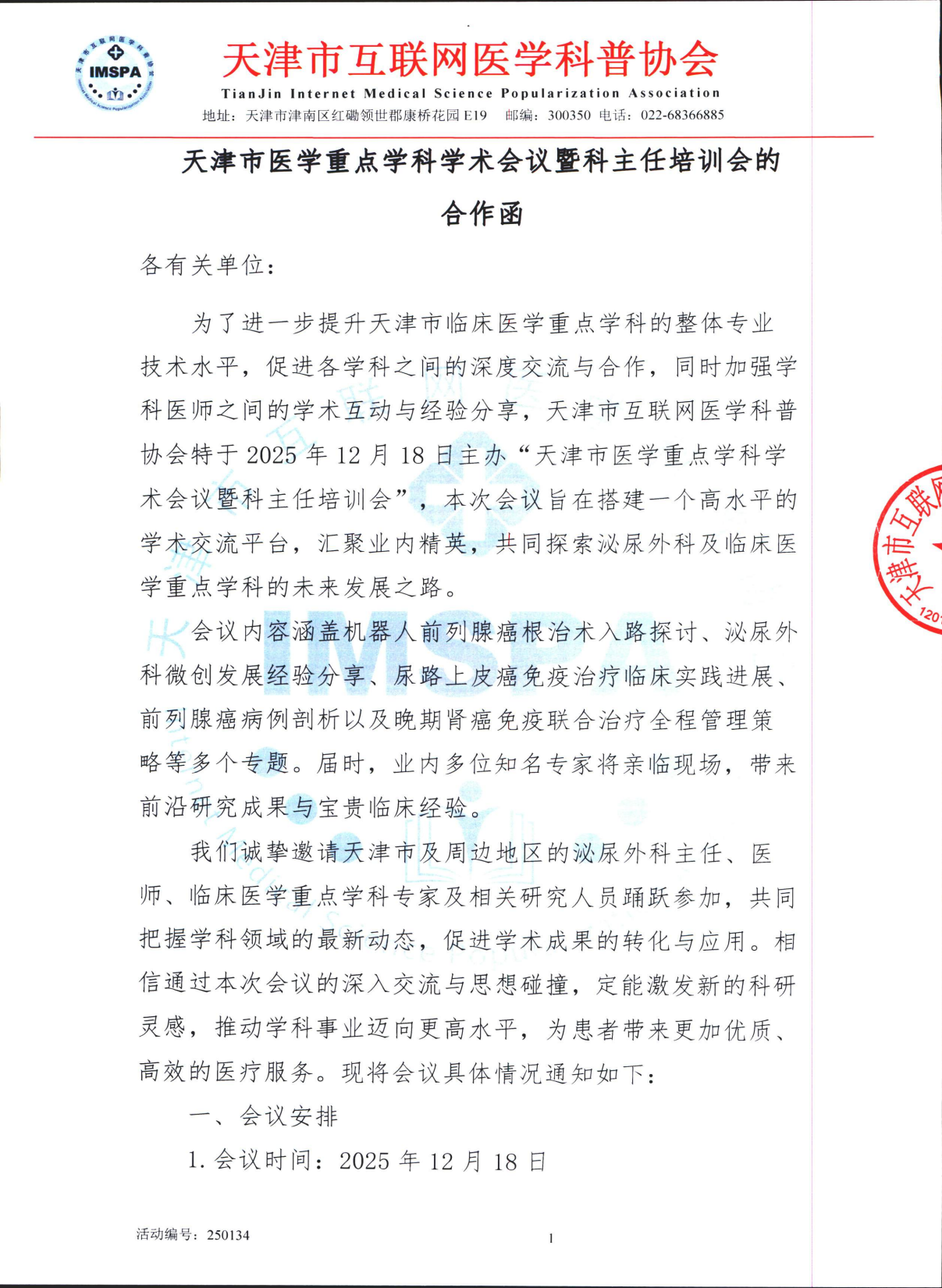 2025年天津市医学重点学科学术会议暨科主任培训会合作函
